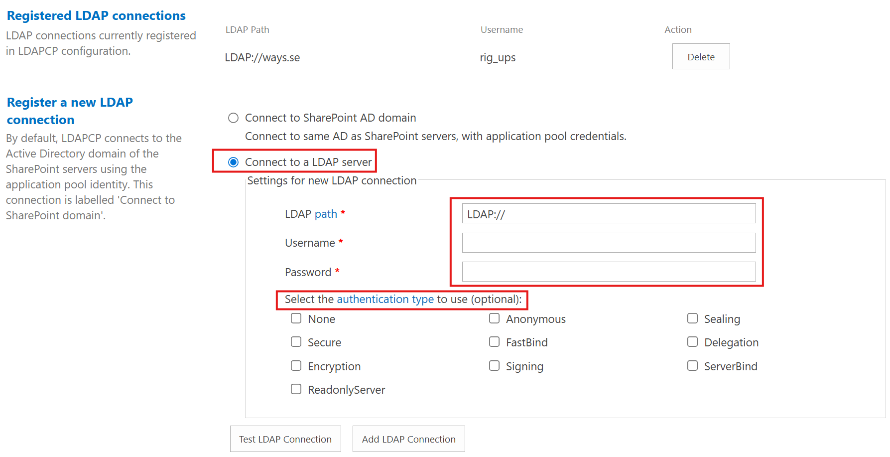 - Configure the LDAP connection. In this example we are using the user profile synchronization service account, that should have the required access to Active Directory.