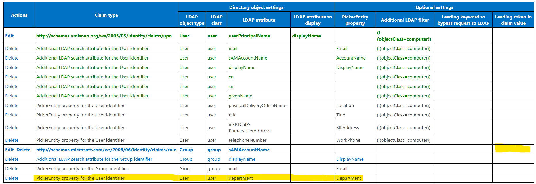 - Open SharePoint Central Administration and go to Security > LDAPCP > Mapping of permissions. Configure the mappings as in the image blow. Notice that we have removed the prefix on groups, since we have mapped role to unqualified group names in AD FS. We have also added department as PickerEntity metadata, this allows searching for this in the people picker.